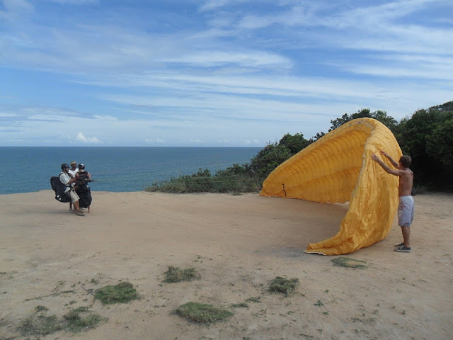 Kohale jõudes tegin juttu paragraida inimestega. Kohtusin instruktoriga ,keda kutsuti Bla-ks. Käriseva häälega elukutseline langevarjur. Nime olevat saanud mees endale sõnast Bla Bla, mis tuleneb lobapidamatusest. Igaljuhul huumorimeelt ning sõbralikkust sellel vennal jätkus. Ta võinuks olla korralik joomakaaslane. Selgus ,et tegevus kestab ligi 15-20minutit, mis on päris pikk aeg. Maksumus 180 reaali, mis teeb ligi 100USD. Ei hakanud pikalt mõtlema, olin tulnud pikamaa siia ,et midagi teha. Nõustusin pakkumisega ning võtsime teekonna 15min kaugemale kalju otsa, mis asetses otse ranna ees. Ilm oli selleks hetkeks, võtnud pisut teise pöörde. Taevas oli pilvine ,kuid tuulevaikne. Ilm pani tegevuse küsimärgi alla.